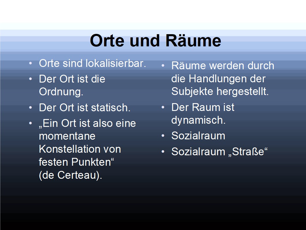 Orte und Räume werden begrifflich unterschieden. Sozialräume werden konstruiert, also durch Subjekte hergestellt. Die Raumgrenzen werden nicht zwischen physischer Welt und virtueller Welt gezogen. Das Internet ist kein „zusätzlicher Sozialraum“ – verstanden als weiterer Raumcontainer – sondern es kann Sozialräume erweitern oder auch beschränken, je nach den subjektiv vollzogenen Grenzziehungen.